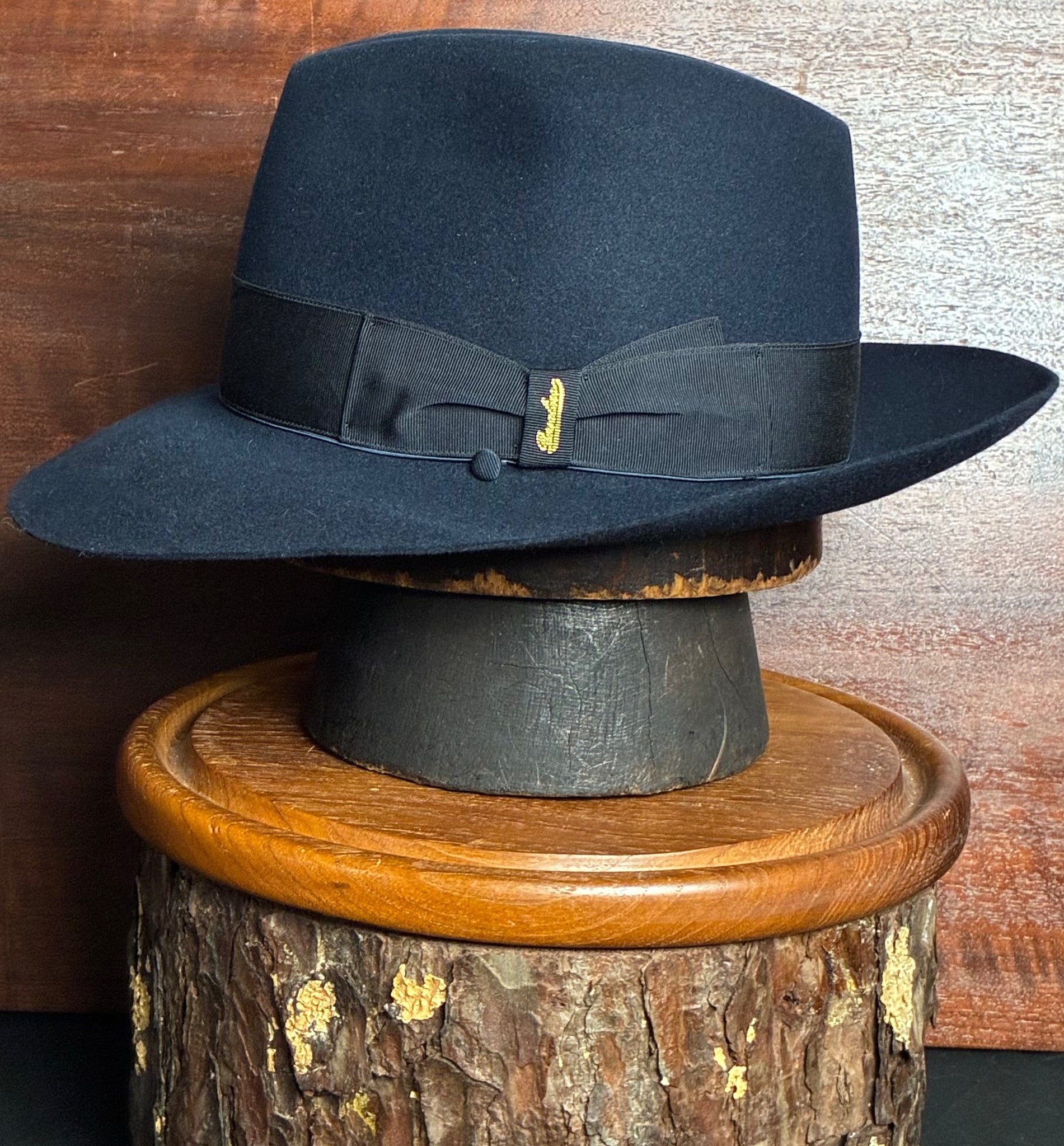 Size 7 1/4, color blueberry, 4 1/4 inch pinched center dent crown, 3 1/4 inch raw edge snap brim, 1 1/2 inch grosgrain band. Genuine fur felt. Soft and shapable. Really a high quality piece.